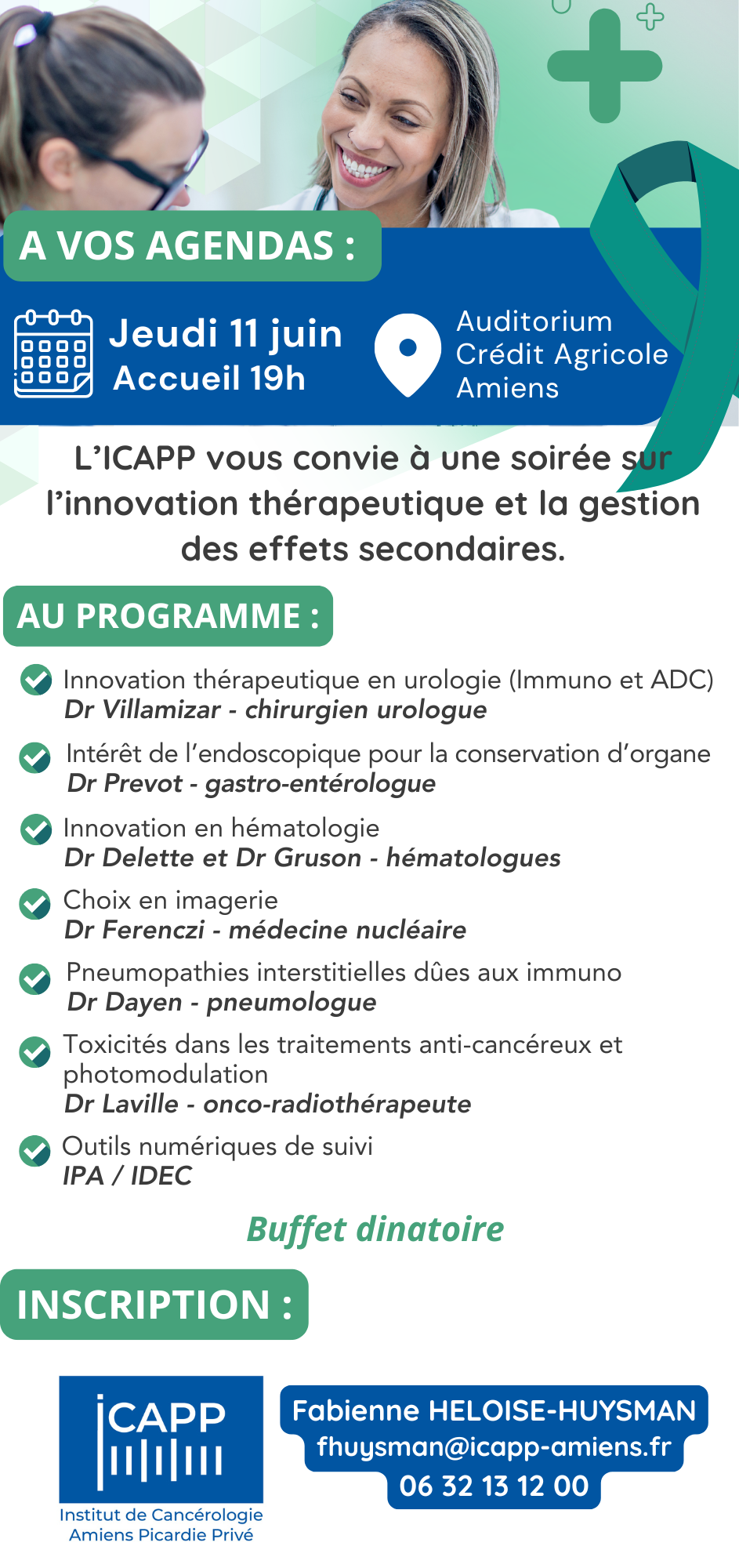 L’Institut de Cancérologie Amiens Privé (ICAPP) organise une soirée exceptionnelle dédiée au cancer du poumon, le mardi 25 novembre à 19h, au Quai de l’Innovation à Amiens. Cet événement s’adresse aux professionnels de santé désireux de s’informer sur les dernières avancées médicales et thérapeutiques dans la prise en charge de cette pathologie. ost